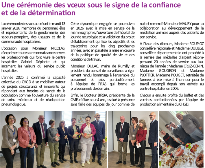 Actualités Cérémonie des vœux Accueil Général Cérémonie des vœux Partage Ces articles pourraient vous plaire coquelicots Des acteurs de Haute-Savoie engagés pour Alzheimer à l'Assemblée nationale Jeudi 23 septembre s'est tenu le colloque Alzheimer organisé à l'Assemblée nationale par la député de notre circonscription Lire plus CHGD Les Parcours du cœur récompensés le CH une nouvelle fois récompensé par la Fédération française de cardiologie pour ses performances lors des Parcours du cœur Lire plus
